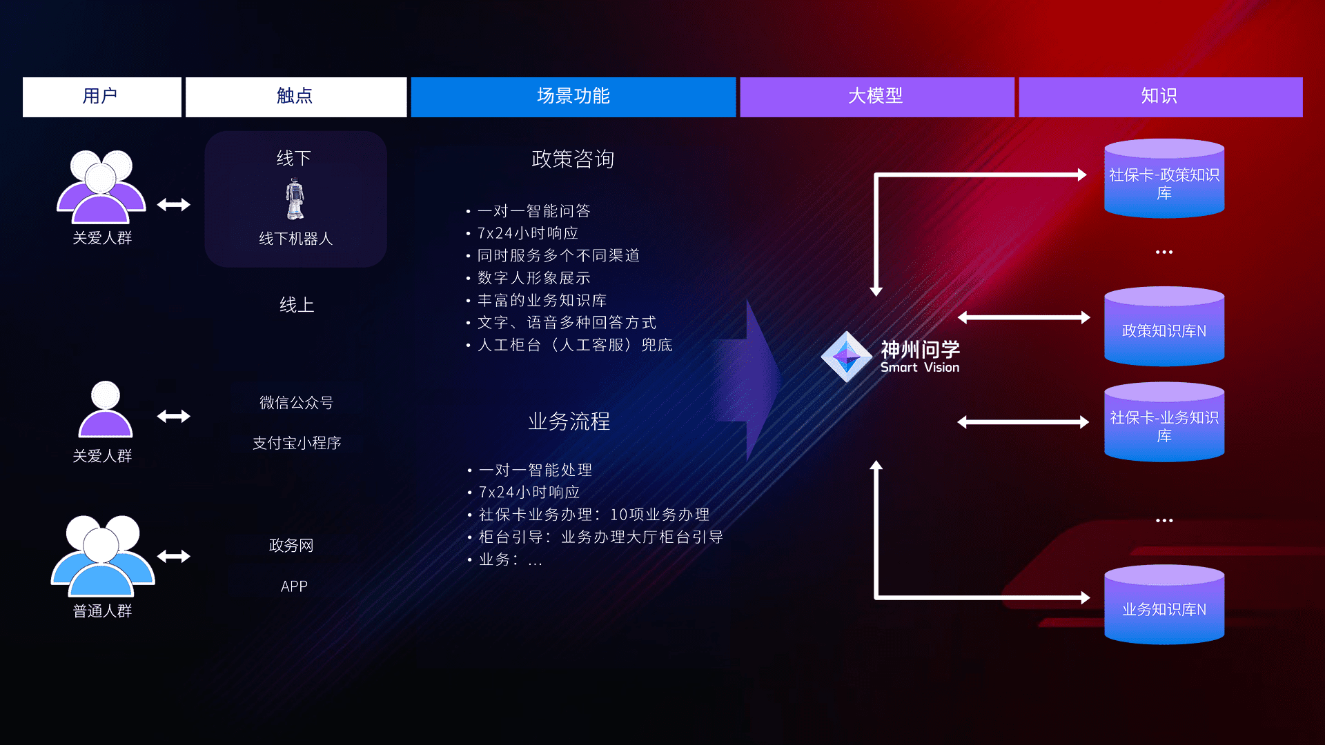 • 利用大语言模型+RAG技术,,,支持多轮对话,,,,可识别多种同义词、、、、近义词,,,精准理解关爱人群语义快速输出结果。。